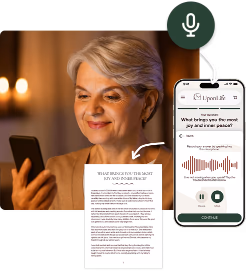 UponLife makes storytelling effortless. Speak your memories or respond to guided prompts, and watch your words become a stunning heirloom book, crafted to be shared for generations.