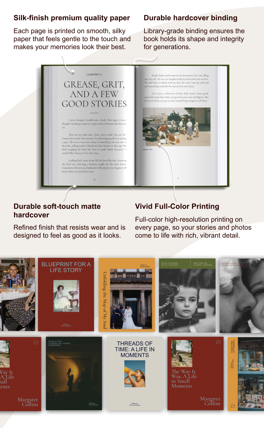 Add photos to your life story book, wrap it in a beautiful cover, create your title, and choose thoughtful add-ons like audiobooks, gift boxes, and extra printed copies for family & friends.